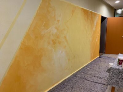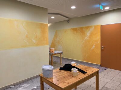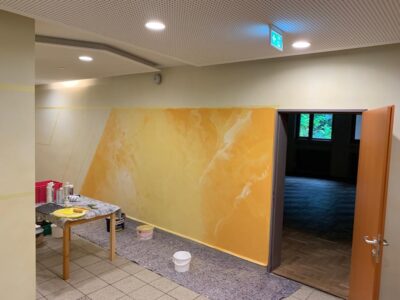 Mal klassisch-zurückhaltend, mal peppig und frisch, Lasur ist nicht gleich Lasur. Eine ruhige, dezente Lasur „weitet“ den Raum, und lässt ihn interessanterweise oft größer erscheinen. Die aufeinander aufbauenden, oft farbverwandten Schichten ergeben ein changierendes Spiel auf der Fläche, das die Wand nicht als so „dicht“, sondern als „lebendig- atmend“ erscheinen lässt. Persönlich bevorzuge ich eher ruhige, zurückhaltende Lasuren. Selbstverständlich – je nach architektonischer Situation – ist auch mal ein Farbakzent in Form eines „Hinguckers“ oder als Anhaltspunkt für das Auge angebracht. In einem Bistro beispielsweise habe ich mit groben Bürsten komplementäre Farben in Form einer Lasur so aufgebracht, dass dadurch eine gewisse „Frische“ entstanden ist. Lasuren habe ich in Kliniken, Schulen, Kindergärten, Arztpraxen, Firmen und in Privathäusern angewandt.